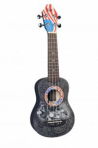 FLIGHT EP SM - Elvis Presley® укулеле, сопрано, дизайн Moto, цвет черный, верхняя дека - сапеле, корпус - сапеле, чехол в комплекте