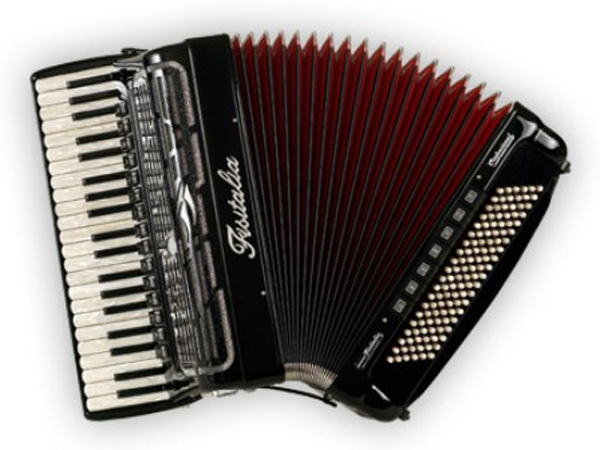 Пятиголосый профессиональный аккордеон с голосами ручной работы Fisitalia 41.55-TC. Кол-во клавиш справа: 41. Кол-во клавиш слева: 120. Кол-во регистров справа: 15+M. Кол-во регистров слева: 7. Кол-во басовых голосов: 5. Вес: 12.3 кг. Звучание мелодии от «Фа» до «Ля»