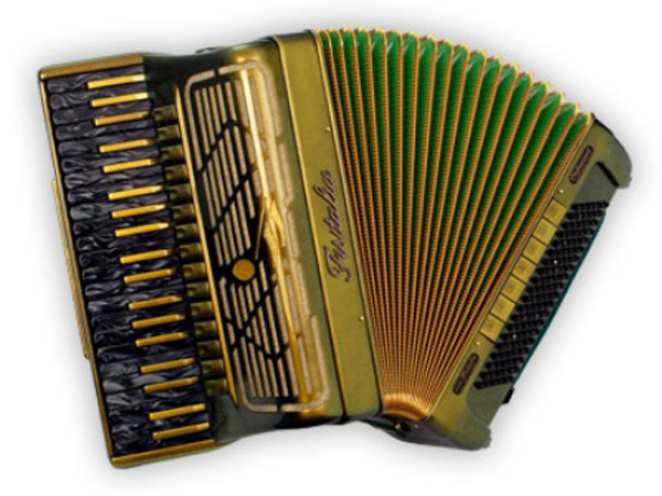 Пятиголосый профессиональный аккордеон с ломаной декой и голосами особенной ручной работы Fisitalia Specialmusette. Кол-во клавиш справа: 41. Кол-во клавиш слева: 120. Кол-во регистров справа: 15+M. Кол-во регистров слева: 7. Кол-во басовых голосов: 5. Вес: 12.3 кг. Звучание мелодии от «Фа» до «Ля»