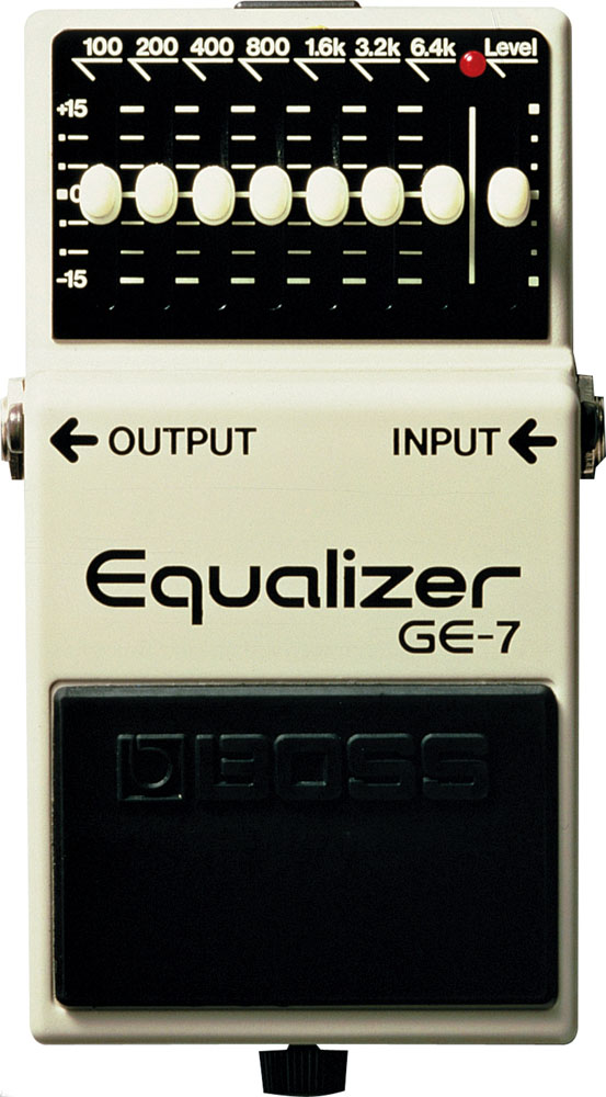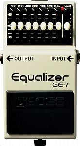 BOSS GE-7 - это 7-полосный эквалайзер с регулируемым уровнем выхода. Каждую полосу можно урезать или бустануть на 15 Дб от выходного уровня. Сама ручка уровня также режет или наоборот несколько усиливает сигнал. У GE-7 очень хороший байпасс, а переключение осуществляется без посторонних звуков.